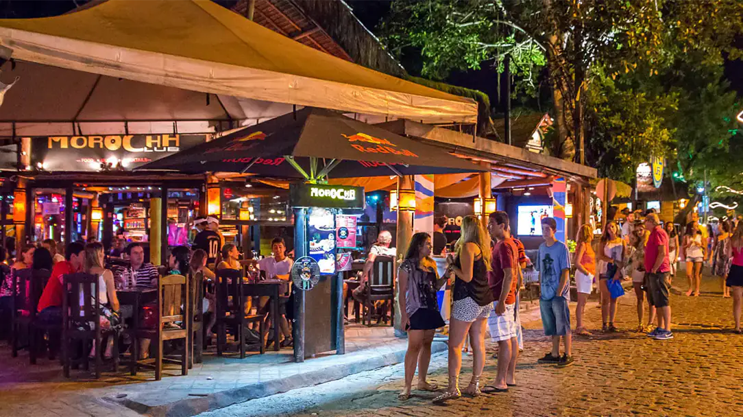Arraial d’Ajuda é destino certo para quem gosta de curtir uma praia durante o dia mas não abre mão de um balada a noite, a Rua do Mucugê oferece inúmeras opções de restaurantes, lojas, bares, sorveterias, musica ao vivo, destaque para o Beco das Cores que conta com dois palcos onde rola diversos estilos musicais além de estúdio de tatuagem, piercing, pizzaria entre outros.